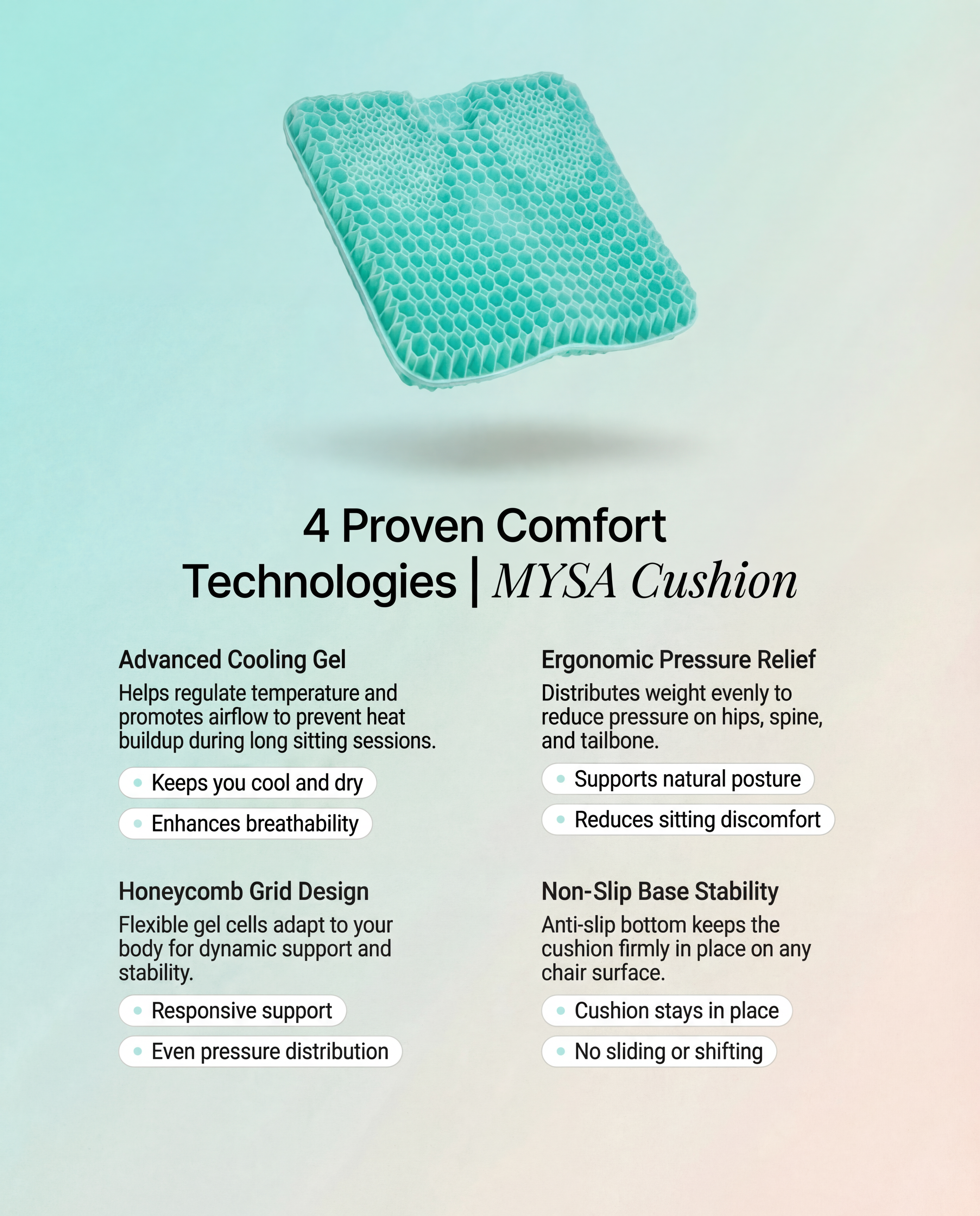 Memory foam tends to trap heat and lose responsiveness over time. Mysa Comfort uses a reinforced gel design paired with an ice silk polyester cover to promote airflow, reduce heat buildup, and provide consistent rebound after every use.